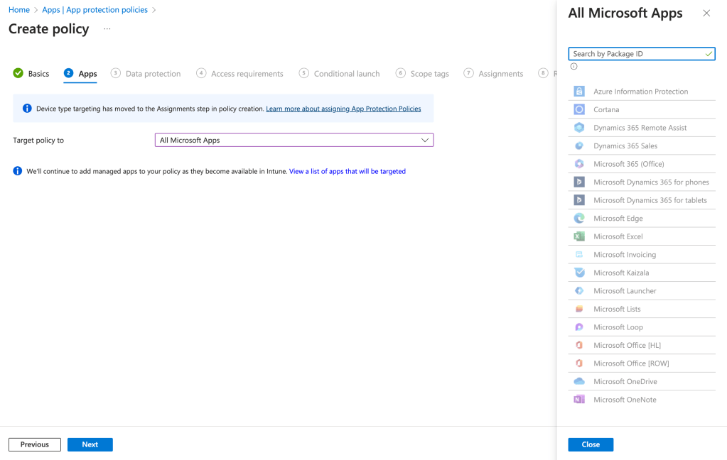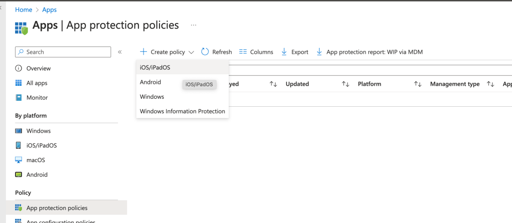 As it is aimed to secure an application go to Apps > App protection policies. Then, pick the platform and the applications you want to secure :