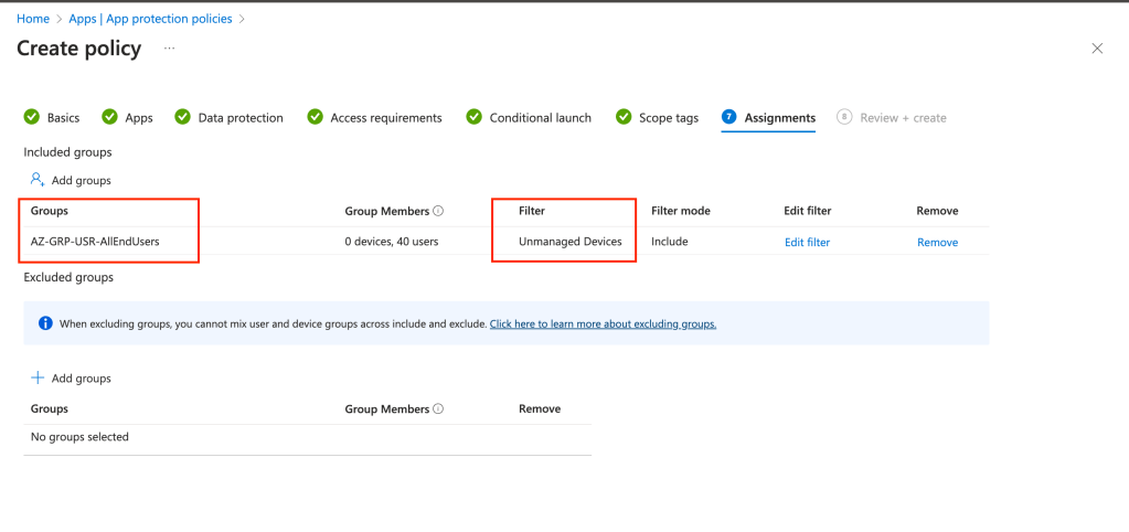 Which in our case means : Assign the MAM policies on every users but only on unmanaged devices. Have a look on my filter :