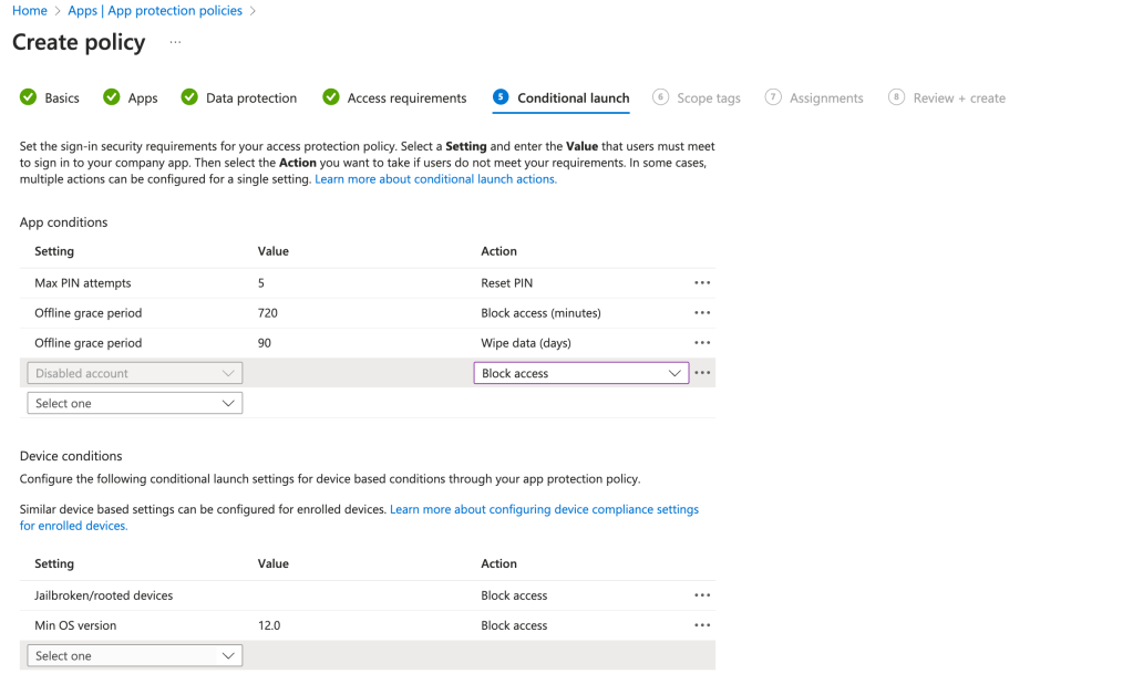 Again, these settings will be applied on managed devices and/or unmanaged devices. Think about the end-user experience on personal devices and try to find a compromise between a solid security and a suitable end-user experience.