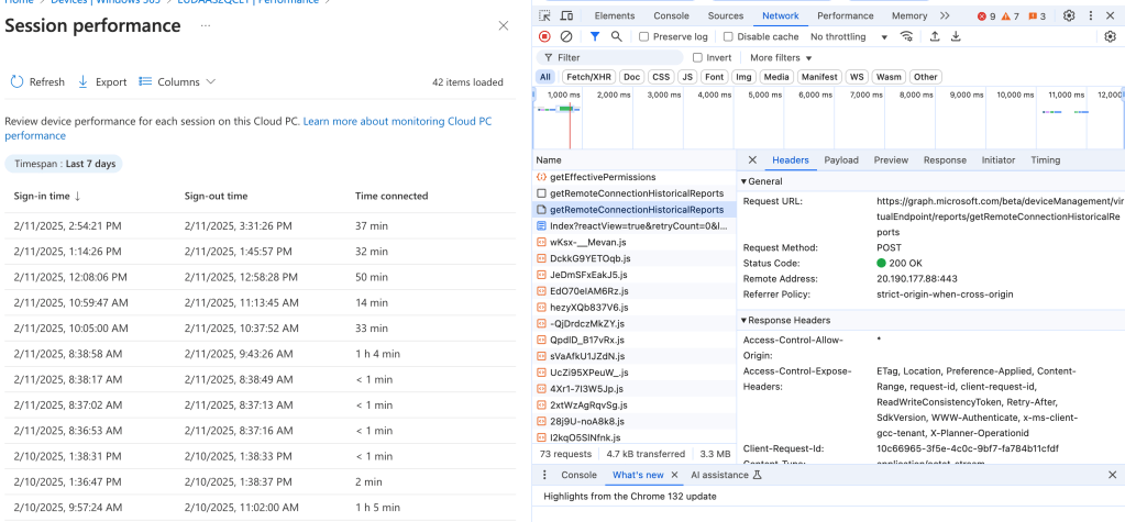 Oooh : {“top”:50,”skip”:0,”filter”:”CloudPcId eq ‘c86b874c-45af-4eac-bc64-35d00ab6d374’ and SignInDateTime gt datetime’2025-02-05T05:57:25.772Z'”,”select”:[“SignInDateTime”,”SignOutDateTime”,”UsageInHour”],”orderBy”:[“SignInDateTime desc”]}