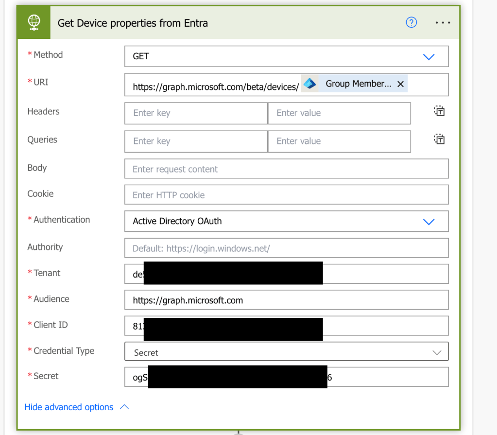 For each device, you want to get devices info from Entra. Objectids can be retrieved dynalically, no need for a variable. The Graph request is done through an HTTP Get request :