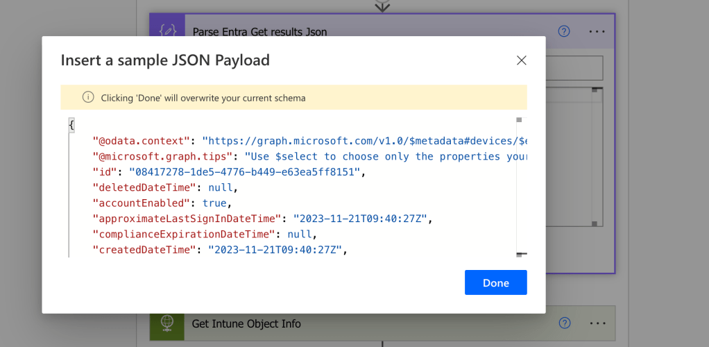 To do that, pick “Parse JSON”, and in the schema requested, copy paste the output you have when calling the API in the Graph Explorer :